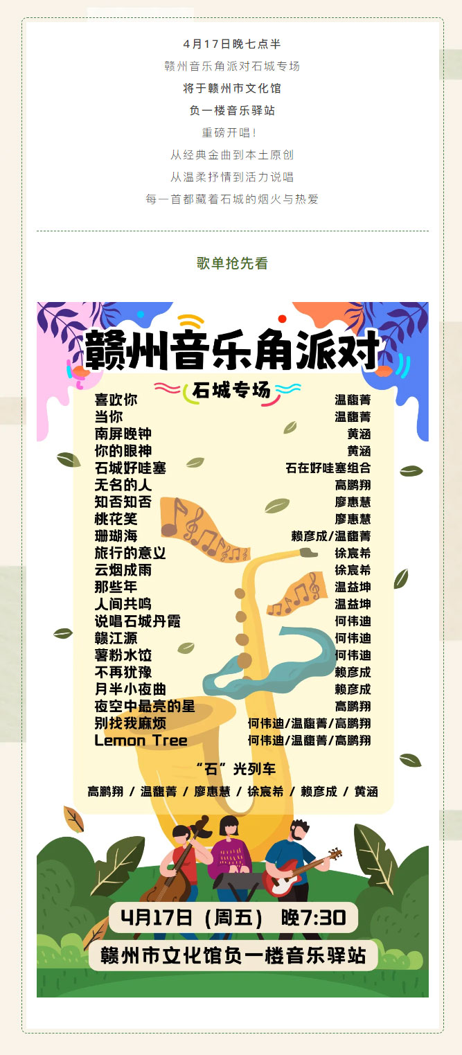 赣文轻骑兵 | 4月17日赣州音乐角派对·石城专场节目单官宣!