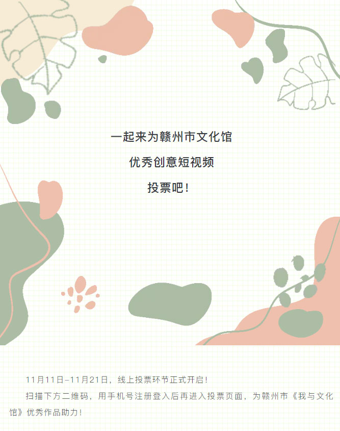 ※ 特别声明:本公众号仅用于赣州市文化馆公共文化服务及群众文化艺术普及,不用于任何商业用途。所转载文章及图片、视频、音频等版权均属原作者。如有侵权,请及时与本公众号联系。
