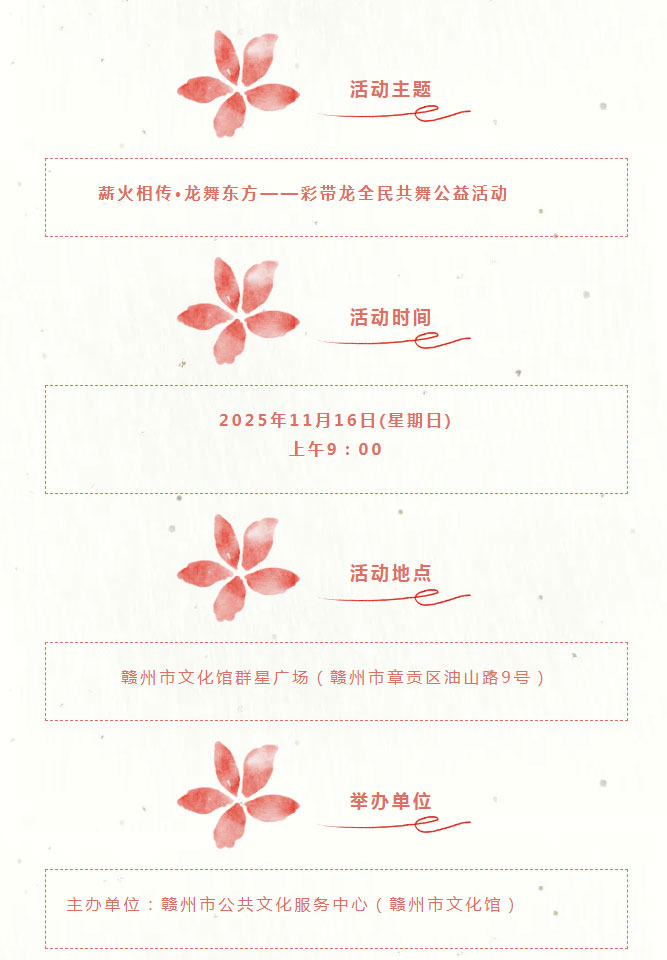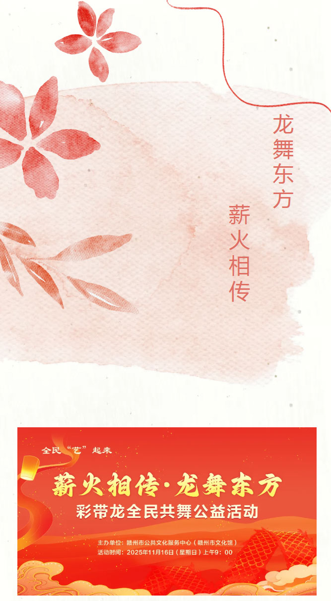 ※ 特别声明:本公众号仅用于赣州市文化馆公共文化服务及群众文化艺术普及,不用于任何商业用途。所转载文章及图片、视频、音频等版权均属原作者。如有侵权,请及时与本公众号联系。
