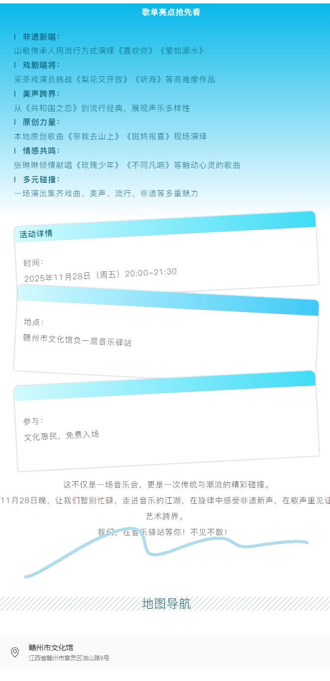 ※ 特别声明:本公众号仅用于赣州市文化馆公共文化服务及群众文化艺术普及,不用于任何商业用途。所转载文章及图片、视频、音频等版权均属原作者。如有侵权,请及时与本公众号联系。