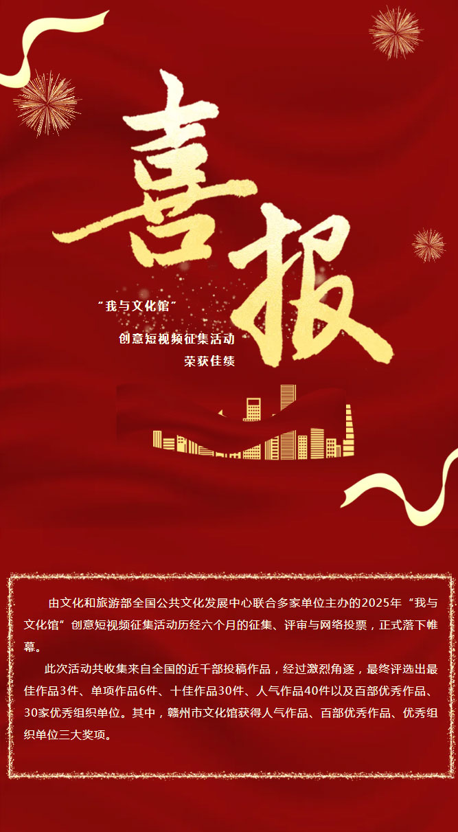 ※ 特别声明:本公众号仅用于赣州市文化馆公共文化服务及群众文化艺术普及,不用于任何商业用途。所转载文章及图片、视频、音频等版权均属原作者。如有侵权,请及时与本公众号联系。