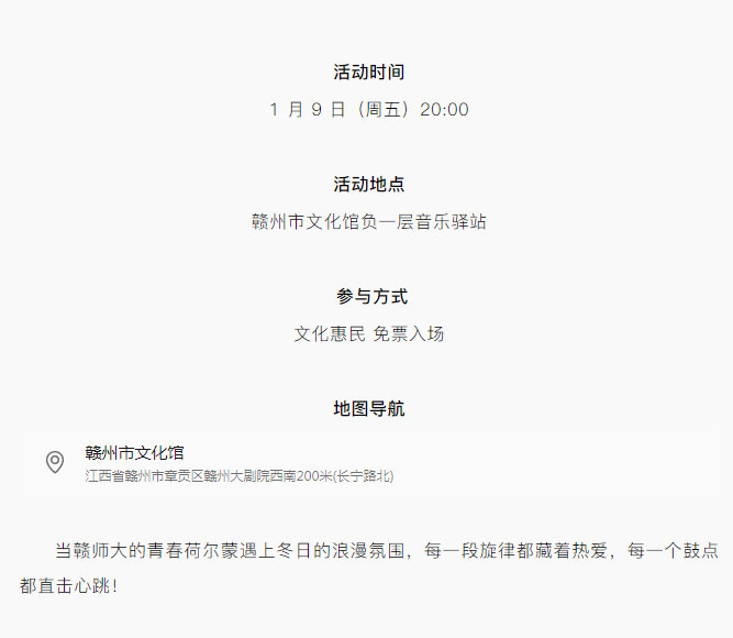 ※ 特别声明:本公众号仅用于赣州市文化馆公共文化服务及群众文化艺术普及,不用于任何商业用途。所转载文章及图片、视频、音频等版权均属原作者。如有侵权,请及时与本公众号联系。