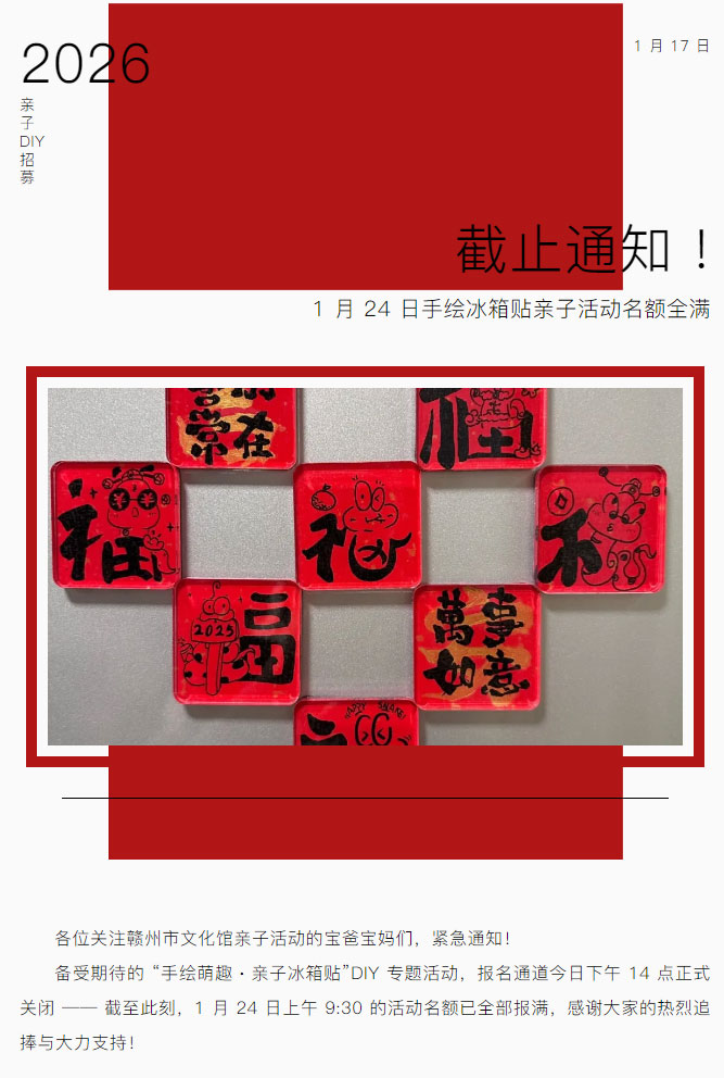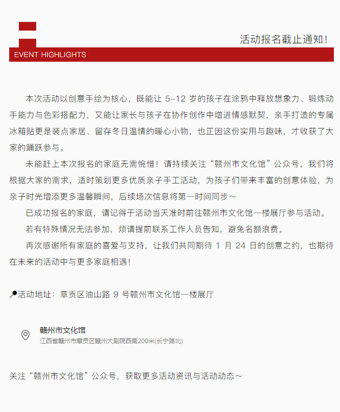 ※ 特别声明:本公众号仅用于赣州市文化馆公共文化服务及群众文化艺术普及,不用于任何商业用途。所转载文章及图片、视频、音频等版权均属原作者。如有侵权,请及时与本公众号联系。
