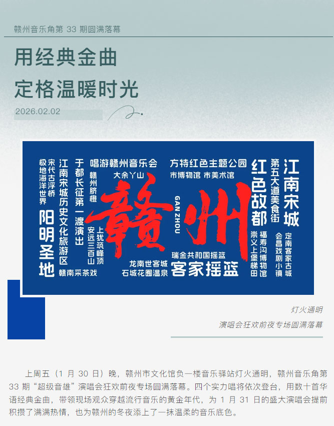 ※ 特别声明:本公众号仅用于赣州市文化馆公共文化服务及群众文化艺术普及,不用于任何商业用途。所转载文章及图片、视频、音频等版权均属原作者。如有侵权,请及时与本公众号联系。