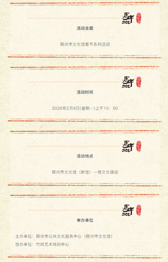 ※ 特别声明:本公众号仅用于赣州市文化馆公共文化服务及群众文化艺术普及,不用于任何商业用途。所转载文章及图片、视频、音频等版权均属原作者。如有侵权,请及时与本公众号联系。