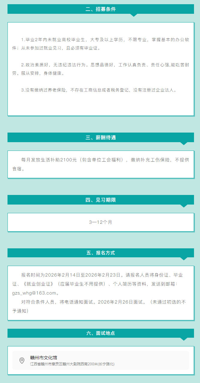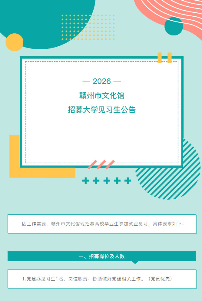 当前位置: 首页 > 文化动态 > 招募公告 | 赣州市文化馆招募大学见习生
