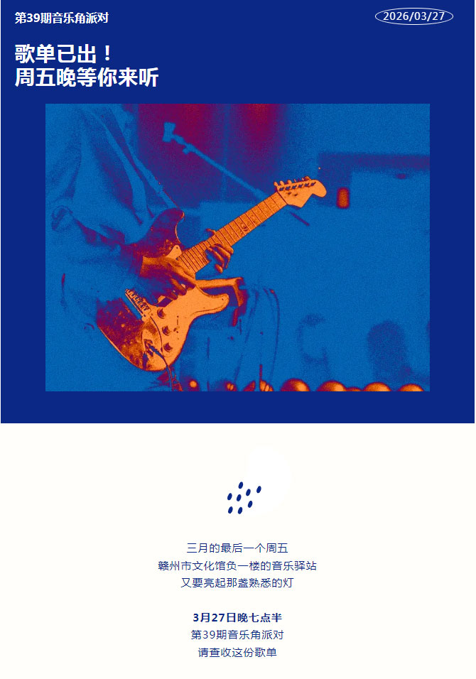 当前位置: 首页 > 文化动态 > 赣文轻骑兵 | 第39期音乐角派对,歌单已出!周五晚等你来听