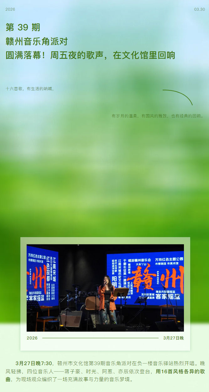※ 特别声明:本公众号仅用于赣州市文化馆公共文化服务及群众文化艺术普及,不用于任何商业用途。所转载文章及图片、视频、音频等版权均属原作者。如有侵权,请及时与本公众号联系。