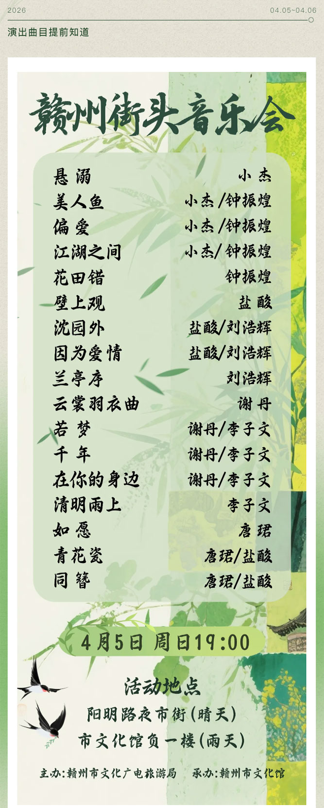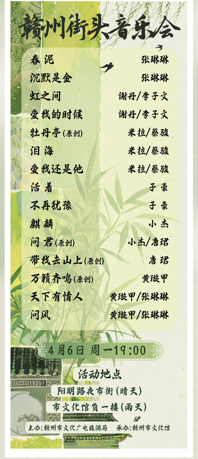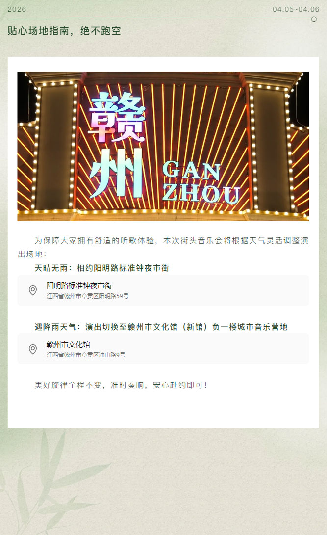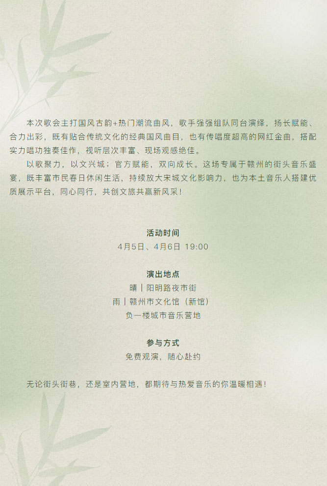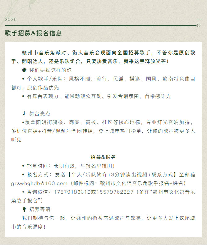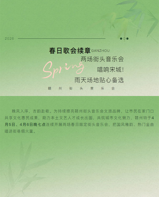 ※ 特别声明:本公众号仅用于赣州市文化馆公共文化服务及群众文化艺术普及,不用于任何商业用途。所转载文章及图片、视频、音频等版权均属原作者。如有侵权,请及时与本公众号联系。