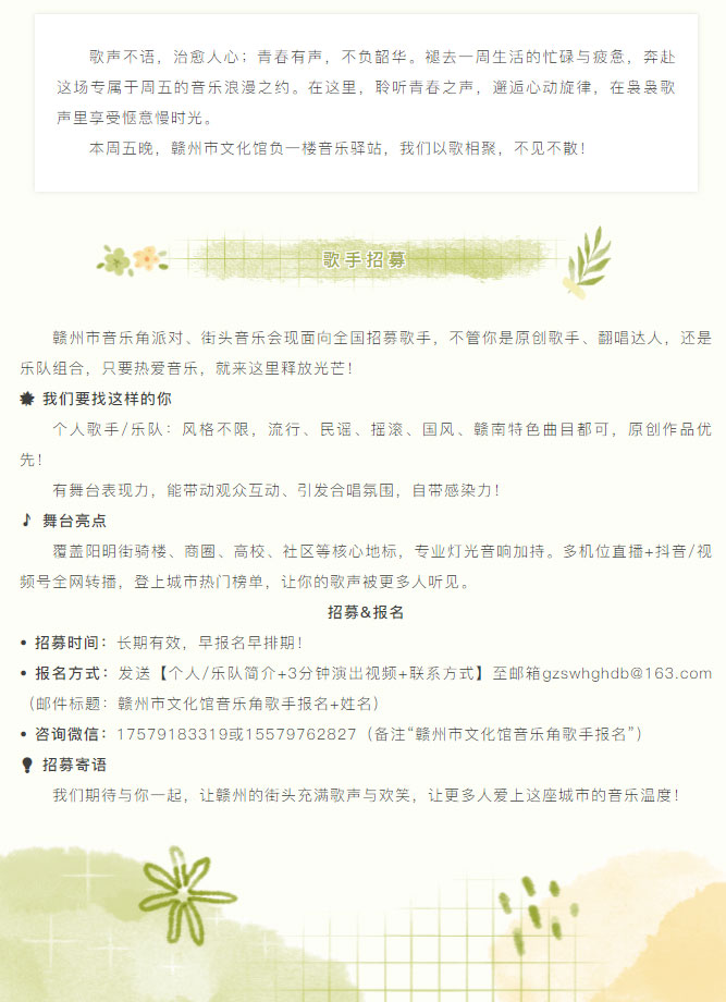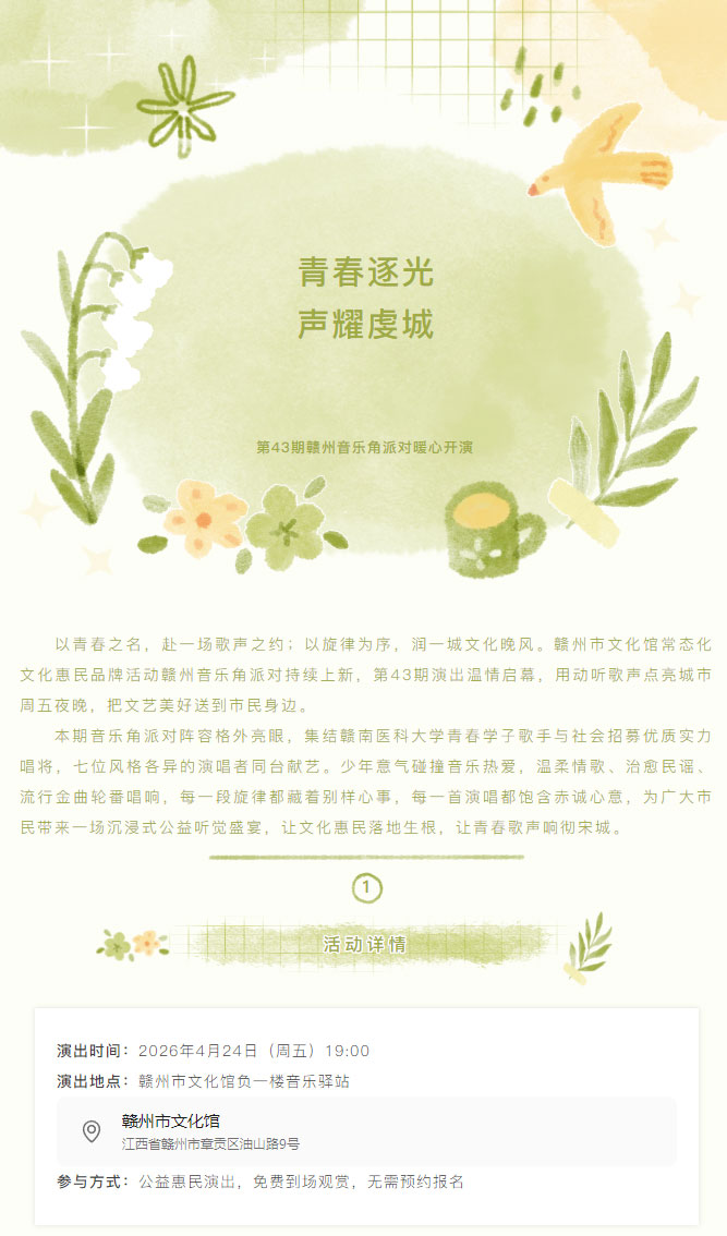 ※ 特别声明:本公众号仅用于赣州市文化馆公共文化服务及群众文化艺术普及,不用于任何商业用途。所转载文章及图片、视频、音频等版权均属原作者。如有侵权,请及时与本公众号联系。
