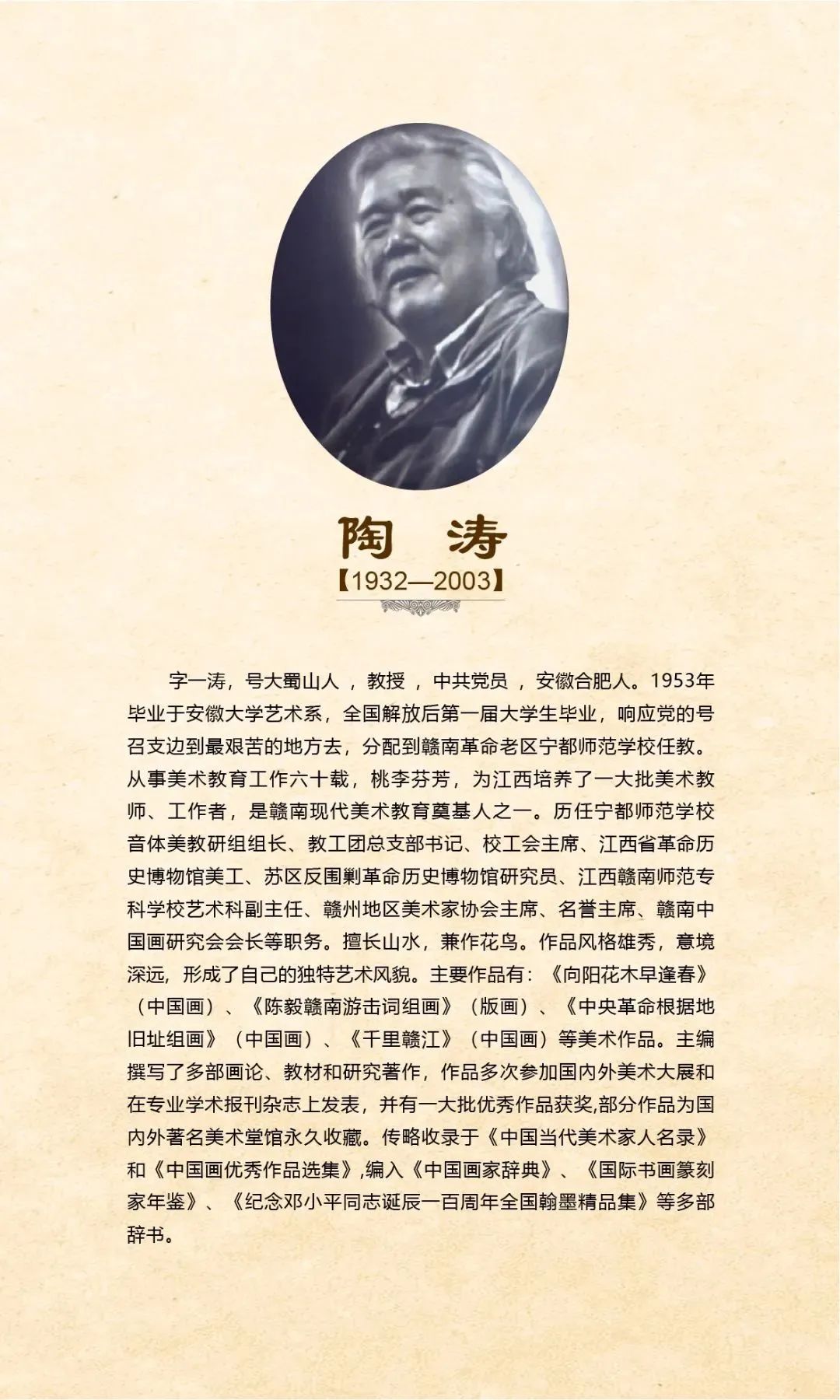 为回顾赣州已故老一辈知名画家艺术历程,发掘与展示他们留存在世的艺术作品,促进赣州美术事业的传承、创新与发展,由赣州市文学艺术界联合会、赣州市美术家协会主办,赣州市章贡区红杉里艺术馆承办的“晚芳犹香——赣州十老作品展”于2023年1月16日至2月20日在红杉里艺术馆展出,并召开了赣州“十老”绘画艺术研究座谈会(注:"十老"按姓氏笔画排序为许又硕、江定和、李炯、杨海峰、林植松、钟炳麟、钟炳芳、陶涛、曾兆芹、潘君武)。今天赣州市文化馆特根据本展推出陶涛作品。